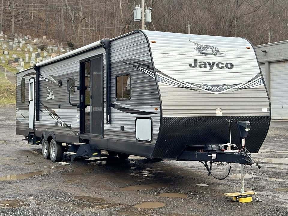 The 2020 Jayco Jay Flight 38BHDS is a large travel trailer known for its spacious, family-friendly layout, featuring a private rear bedroom with a king bed slide, a walk-through bathroom, and a front bedroom with a queen bed, sleeping up to 8 people with a U-shaped dinette and sofa. Key features include a large kitchen with stainless appliances, power awning with LED lights, outdoor speakers, backup camera prep, solid construction like Dexter axles and Magnum Truss roof, and ample storage, making it a popular choice for extended trips. Key Specifications & Features: -Sleeping Capacity: Up to 8 people. -Slideouts: 2 (one for the king bed, one for the dinette/sofa). -Length: 40' 4". -Weight: Dry weight 8498 lbs -Kitchen: Seamless countertops, undermount sink, pantry, microwave, Furion range/oven, large stainless fridge, DVD player, Bluetooth radio. -Bathroom: Walk-through design, porcelain toilet, skylight, linen closet, solid glass shower. Exterior: -Power awning with LED lights/speakers, outside TV mount, rear ladder, backup camera prep, patio door. Construction: -Dexter axles, E-Z Lube hubs, Magnum Truss roof system. Water: -80-gallon fresh water tank, 10-gallon water heater. Interior Highlights: -Front bedroom: Queen bed, with lights, receptacles, and storage. -Living Area: U-shaped dinette (converts to bed) and jackknife sofa in the main slide -Rear Bedroom: King bed in a slide, ample storage (wardrobes, drawers), charging receptacles, and often a secondary TV prep. Clean title & Recent NYS inspection