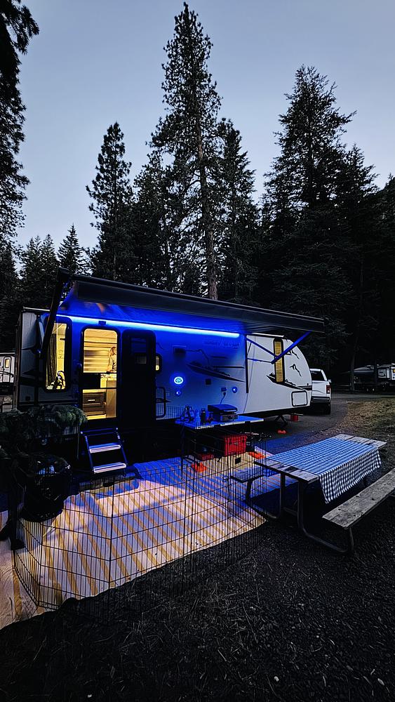On the outside, this trailer is 30 feet from tongue to bumper, enjoy the power awning with LED lighting, power tongue jack, equalizer hitch which can be towed with an F-150, outdoor shower, refrigerator, ice maker, and generous storage space with a custom built slide-out. Comfort features like the 15,000 BTU A/C, two 20 gallon propane tanks, two brand new AGM batteries, 150 watt solar, and premium interior finishes add convenience and value.