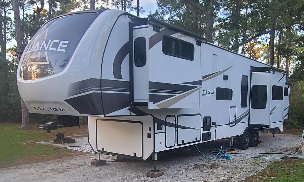 2024 Alliance Paradigm 395DS (Dual Suite). Two bed, two full baths, three A/C units, four slides, slide toppers added, solar panel, two batteries, recent 10k mile axle bearing service, rear camera, two propane tanks, lots of storage. Added pull-out shelving, custom loft steps added, drop-down kitchen butcher block. Asking $89,000.