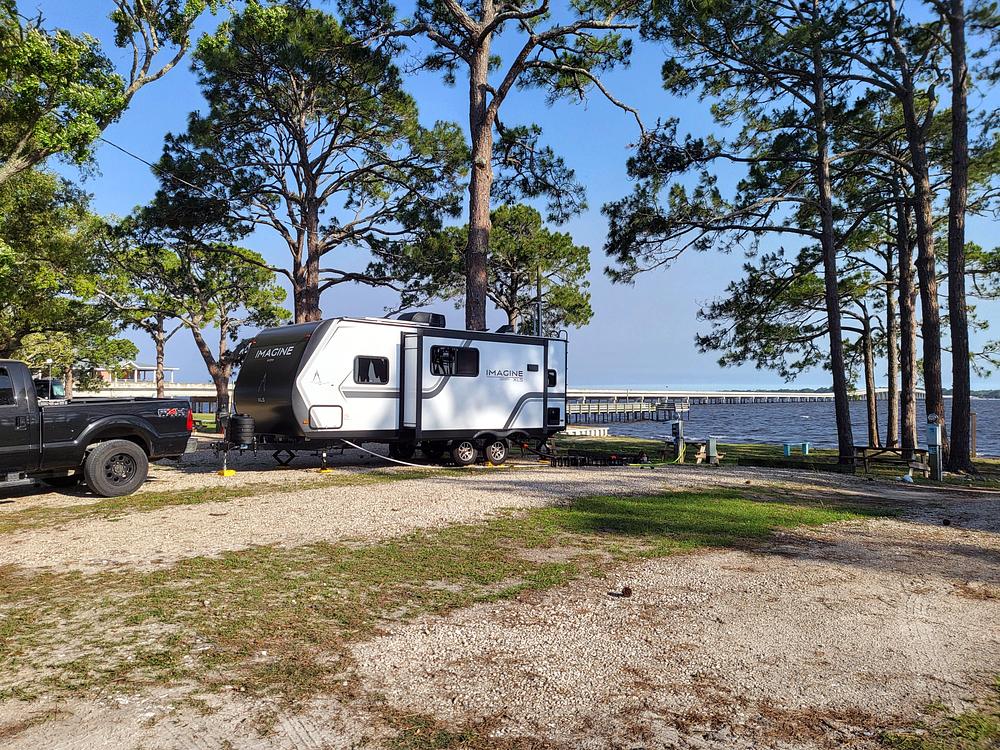 It has theater seating and a booth dinette that converts to a bed, LED HDTV with internet, JBL bluetooth enabled stereo system - like for Pandora or iPad sound. We installed backup camera on top back of trailer to make backing into camping spots easier and for watching traffic behind you. The tow package with sway bars we bought for our truck is included. The front queen-size bed has a privacy curtain that you can draw to create a semi-private bedroom. The 18' electric awning has LED lights. Plugs for electric, gas, and water sprayer are also outside under the awning area, and stereo speakers. A full-size tire is under the camper, and lots of lighted storage. Dual axles. Extra lengths of expandable tubing to reach septic areas are cleverly hidden under the trailer.