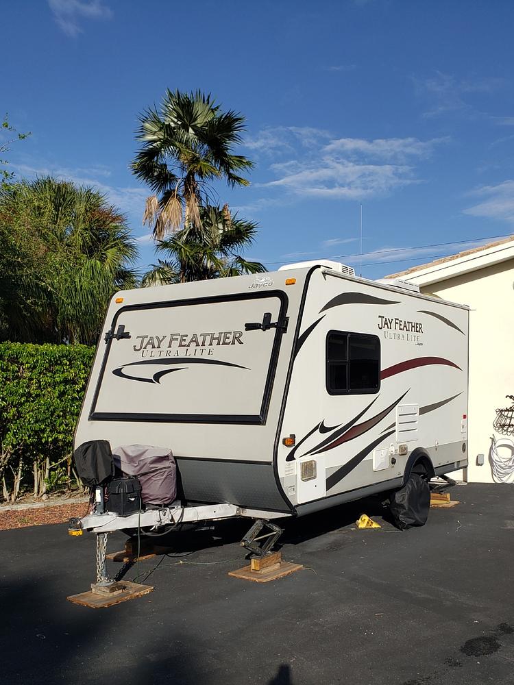 I replaced the manual jack with an electric (maybe in 2023?), last spring I bought a new deep cycle battery and brand new air conditioning unit (just to be sure that both were good to go for me to stay in the trailer for a couple months). I also replaced the kitchen faucet set as it was getting leaky. The tires literally have one trip on them and I've kept them covered and the trailer elevated so as to protect them. Always greased the wheel bearings and replaced them a couple of years back. The exterior has been waxed although the front side has faded some and I applied rv roof coating last year to avoid that leaking which it has never done.
