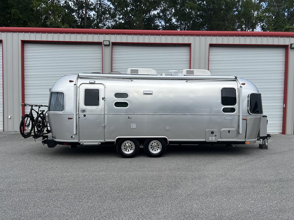 Single owner/private seller. Purchased new October 2024. 25ft Globetrotter Queen (FBQ). Location: Newberry, FL stored under cover. Natural elm interior with luxury woven vinyl flooring. Moen stainless steel sink with DuPont Corian sink cover and countertops. 28 HDTV in living room and 24 HDTV in bedroom. Fusion touch screen stereo with surround sound and subwoofer. 25,000 BTU furnace with electronic ignition. Tankless water heater. Voyager rearview digital wireless monitoring system. Progressive Dynamics 110V/12V Multi Stage Converter. Four powered heavy duty stabilizer jacks with rubber pads attached. VIP 3500 power hitch jack with cover. MSRP $139,875. 50 AMP service dual AC with heat pump/Quietstream AC with heat pump and electronic thermostat. Stainless steel LP gas stove and convection smart air fry and grill microwave oven. 3-panel, 300w rooftop solar charging system with two lithium batteries. BlueOx SwayPro weight distribution hitch. Airstream dealer-installed Torklift EcoHitch X8001 for using bike rack on the rear of the RV. Swagman ESCAPEE RV-approved, ebike approved bike rack.