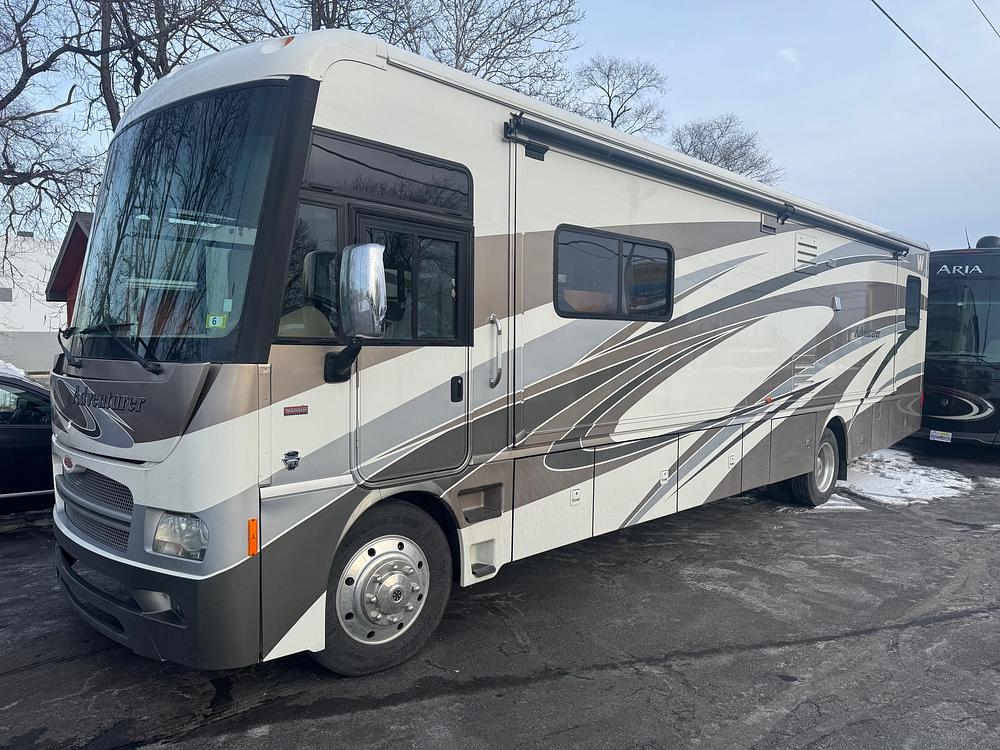 2013 Winnebago Adventurer 37F, 38’ Class A motorhome, 1.5 bathroom, 27745 original miles, 1 owner, stackable washer and dryer, 27745 original miles, LCI electronic automatic leveling, battery boost, fog lights, power night shade, power solar shade, power heated mirrors, coach heater, tow/haul mode, drivers door, Ford F53 chassis, 6.8L V10 gas engine, map lights, passenger work station, leather driver and passenger seats, both front seats swivel back, Jensen AM/FM/CD/Sirius radio, back up and side view cameras, Dish TV Receiver & Satellite, Sony DVD player, HDMI source selector, 40in Samsung TV, TV is on an electric elevator that hides behind the dining room cabinets, free standing dinette table chairs, 4 chairs, sofa with manual foot rests, 2 seat belts on sofa, free standing rocking recliner. Kitchen has Corian countertops, double stainless steel sink, Atwood Hight Output 3 burner stove, Sharp Insight Convection Microwave, Norcold 4 door fridge and freezer. Mid coach ½ bath with Corian countertops, toilet and storage cabinets, Maxxair fan in ½ bath. Ariston stacked washer and dryer. Master bedroom has a 72in wide x 80in long master bed, new mattress, king bed, no under bed storage, electric adjustable bed, ceiling fan, 26in Samsung TV with storage behind TV, large double mirrored door wardrobe closet, 5 large drawers. Large rear master bath with a large standup shower, Temca Vacu flush toilet, large vanity sink with Corian counter tops, triple mirrored door vanity cabinet, storage cabinet and drawers under vanity sink, (2) RV Comfort ducted AC units, 1 heat pump unit, Xantrex Pro XM1000 inverter, auto generator controller, Atwood 10 gallon propane & electric hot water heater, 18’ electric awning, tan fabric awning with metal sun guard, 2021 engine and house batteries, 5000lb tow hitch, Suburban furnace, Onan RV QG5500 gasoline generator with 116 hours, 50A electric, exterior shower, black tank flush, front pass through compartment, 355/80R22.5 tires, Michelin tires, 2016 date codes, aluminum wheels, slide toppers on all 3 slides. 5 speed automatic with over drive, 3 slides including 1 full wall slide. 24000lb GVWR, 80 gallon fuel tank, 37’5in long, 84in interior height, 88 gallon fresh water, 71 gallon gray water, 52 gallon black tank, 28 gallon propane tank, 40000btu furnace, 3235lbs CCC, 9000lbs front axle, 15500lbs rear axle.