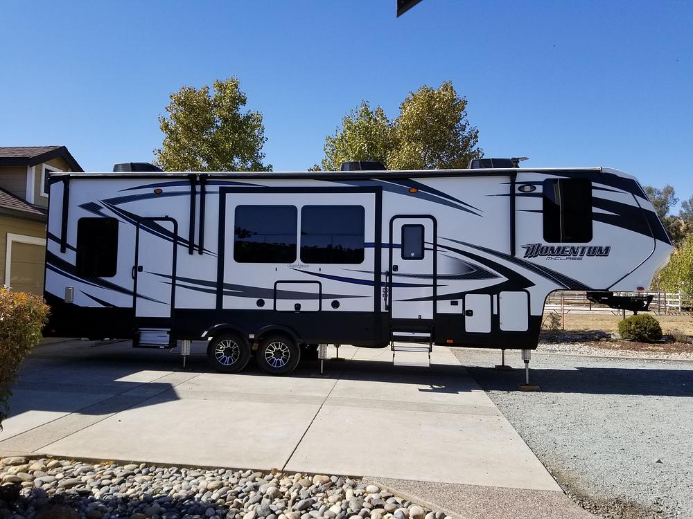 2017 Grand Design Momentum 328M - a luxury fifth wheel toy hauler built for adventure and comfort.