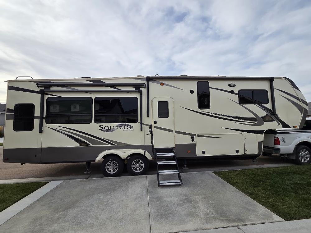 The 2019 Grand Design Solitude S-Class 3350RL is a luxurious fifth wheel trailer that offers unparalleled comfort and style for your RV adventures. This model features a spacious and well-appointed interior with high-end finishes and amenities to make you feel right at home on the road. The open floor plan includes a large living area with comfortable seating, a dining table, and a fully equipped kitchen with modern appliances and plenty of storage space.
