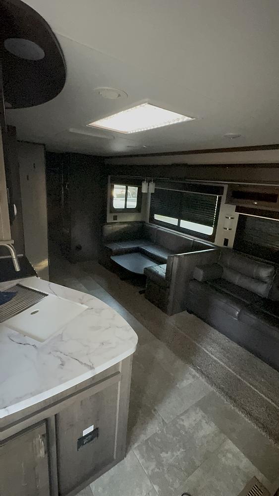Inside, you'll find modern finishes and high-quality materials that create a cozy and inviting atmosphere. The living area features comfortable seating, a dinette, and plenty of storage space for all your belongings. The kitchen is equipped with a refrigerator, stove, microwave, and sink, making it easy to prepare delicious meals on the go.