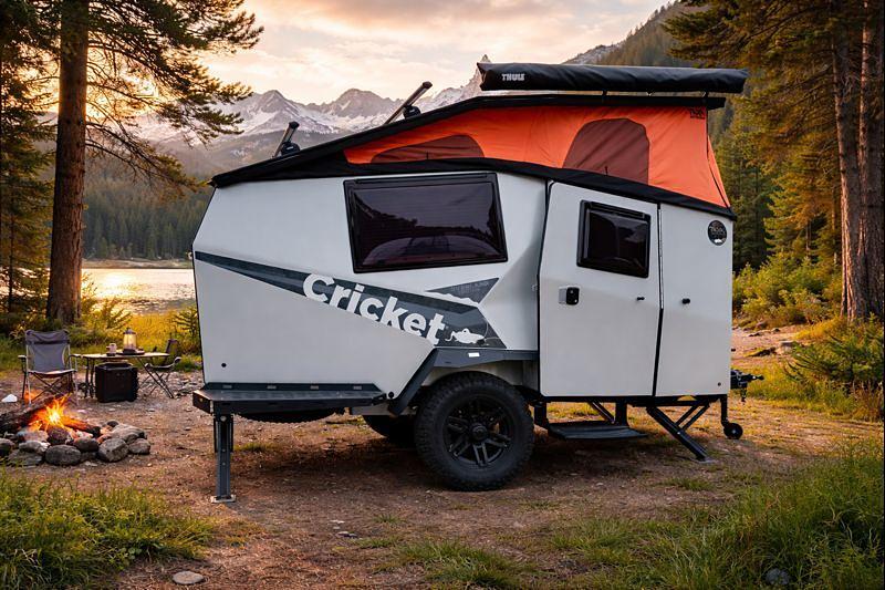 The 2023 TAXA Cricket Overland is a ruggedized, off-grid camper designed for rough terrain, featuring a Timbren axle-less suspension (no crossbar), 16-inch alloy wheels with all-terrain tires, a 4-inch lift, and a Lock-n-Roll hitch. It includes a soft goods package (awning, screen room, shower tent), portable toilet, kids' berths, and pre-wired solar. Key Features and Equipment: Off-Road Upgrades: Timbren axle-less suspension, increased ground clearance, 16" steel spare wheel, and electric brakes.Included Gear (Overland Edition): The "Soft Goods Package" (awning, mesh screen for door, shower tent), two hanging kids' berths (130 max each), and a portable toilet.Power & Utility: 12V system with USB/accessory outlets, LED lighting, 5,000 BTU AC (often standard on Overland), pre-wired solar input, and Truma Combi Eco heating/water system.Kitchen & Interior: Two-burner stove, sink, milk crate storage, and rear dining area that converts to a queen-size bed.Dimensions: Roughly 15 feet in length, under (2,000 lbs} dry weight, . Optional additions often included on these models are the 5,000 BTU air conditioner and a, while a 16-inch spare tire is standard.