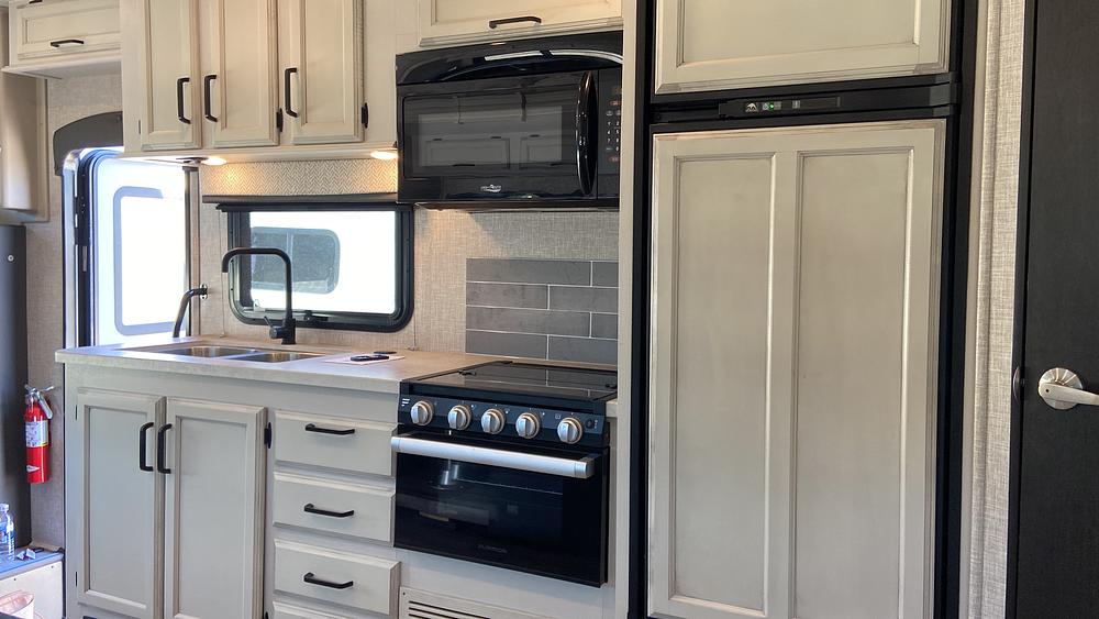 The bedroom in the Entegra Coach Odyssey 24B is a tranquil retreat, with a comfortable queen-sized bed and plenty of closet space for all your belongings. The large windows allow for plenty of natural light, creating a bright and inviting space to relax after a long day of exploring.