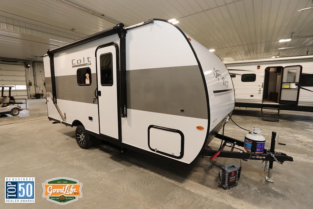 Upgrade from tent camping and experience more comfort with the new Colt Travel Trailer Series, our most budget-friendly RV lineup. Available in single or double axle, standard or CTR Edition, the Colt offers 15 versatile floorplans designed to fit your lifestyle. Inside, you’ll enjoy residential-style features like solid countertops, hidden-hinge cabinetry, a high-rise kitchen faucet, and a 12V refrigerator. The main sleeping area includes a standard queen mattress for home-like comfort, while the bathroom is equipped with a marine-grade foot-flush toilet, tub/shower surround, skylight, vent, and an on-demand tankless water heater that delivers long hot showers. Durable swing-down solid steps provide a sturdy entry every time, giving you confidence with each adventure. Perfect for first-time RVers or anyone seeking an affordable, lightweight upgrade, the Colt Travel Trailer makes camping easy, comfortable, and accessible.