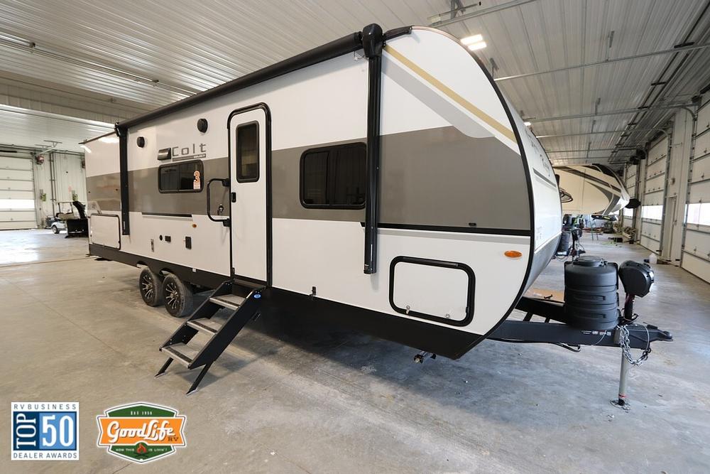 Upgrade from tent camping and experience more comfort with the new Colt Travel Trailer Series, our most budget-friendly RV lineup. Available in single or double axle, standard or CTR Edition, the Colt offers 15 versatile floorplans designed to fit your lifestyle. Inside, you’ll enjoy residential-style features like solid countertops, hidden-hinge cabinetry, a high-rise kitchen faucet, and a 12V refrigerator. The main sleeping area includes a standard queen mattress for home-like comfort, while the bathroom is equipped with a marine-grade foot-flush toilet, tub/shower surround, skylight, vent, and an on-demand tankless water heater that delivers long hot showers. Durable swing-down solid steps provide a sturdy entry every time, giving you confidence with each adventure. Perfect for first-time RVers or anyone seeking an affordable, lightweight upgrade, the Colt Travel Trailer makes camping easy, comfortable, and accessible.