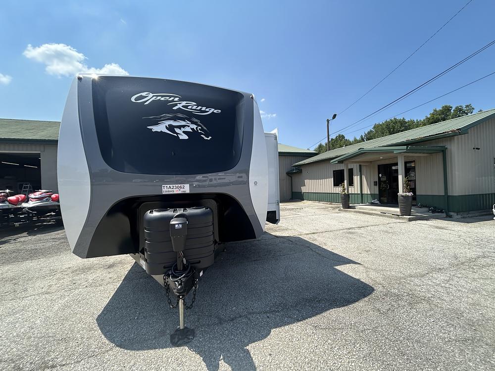 With any Open Range RV Open Range travel trailer, the 100" wide body frame and the ACCU-SLIDE slide system with 42" deep 4-corner compression offer more interior space. Inside, you will also enjoy residential vinyl flooring, raised panel hardwood doors, and two air conditioners with quiet residential return air. The exterior equipment includes Equa-Flex axle suspension, self-adjusting electric brakes, and the Norco 5.1 stabilizer system with BAL lock arms. You will also enjoy the Four Season package that offers ducted heat to underbelly with cold air return, an enclosed exterior docking station, a heated and enclosed underbelly, and a high-performance furnace to mention a few highlights.