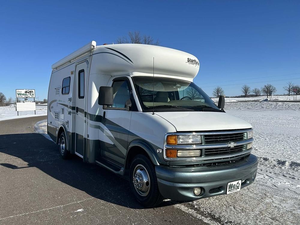 This is a 2002 DynaMax Starflyte. 22 ft bumper to bumper. It is on a Chevy express 3500 chassis. It has the 8.1 L motor, which usually comes with the Allison transmission, with 61,912 miles. Exterior passenger side awning. 4k watt generator, with 793 hours. Interior is really clean, cabinets are in nice shape, with lots of storage. It does have some light carpet wear, coach/bed, dinette/bed, 2 burner cooktop, microwave convection, sink, furnace, water heater and rooftop air conditioning. It does have entertainment system upfront with TV VCR radio/cassette deck combination. Interior and exterior speakers. this is a great camper, ready to hit the road.