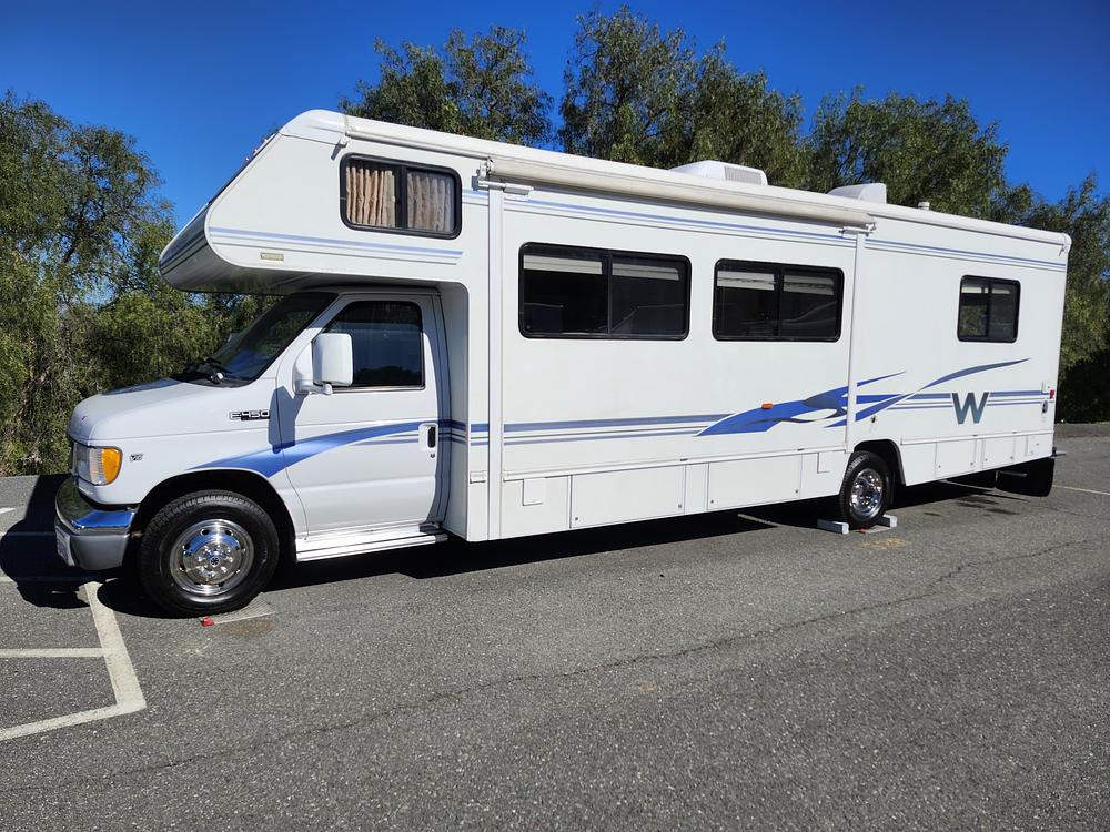 32' 2003 Winnebago Minnie. E450, Triton V10 gas engine. 54,000 original miles. Automatic transmission. 1 owner. One pullout behind driver. Master switch for all batteries is in unit that is charged by solar panels on roof. Separate shower and bathroom with exhaust fan. Heater and air conditioner are in great working order. Queen bed with storage under bed. Bedroom has accordion doors for privacy. TV in bedroom with DVD player. Microwave, oven, stove, refrigerator and freezer all in great working order. New tires. Recent smog certificate. Complete service every 4000 miles. Outside shower. Outside AM, FM radio and CD player with built in adapter for TV. Shelf built on back of RV for storage. Has hitch for towing. Must see to appreciate. Automatic, four leveling jacks. Rear air shocks (stabilizers) for heavier loads. Excellent condition 95,000 miles, Honda CRV tow vehicle, available for purchase.