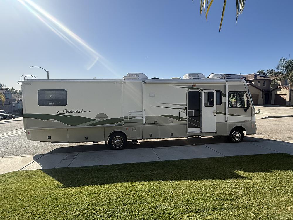 2003 Fleetwood Southwind, 35R Class A Motorhome with Chevy Workhorse Chassis, 8.1 L engine. 71,200 miles with 7 new tires. Two slide outs with expanded space sleeps up to six. Sofa, dinette, and rocker/recliner chair. 30amp electricity, two air conditioners, heater, smoke detector, carbon monoxide detector. Onan Marquis 5.5 kw generator. Rear back up video camera. Kitchen with spacious solid surface countertops, gas stove with oven, microwave, upgraded large propane/ electric refrigerator. Two TVs & new radio. Upgraded solid wood cabinetry with lots of storage, upholstery without tears, upgraded Queen size mattress. Holds 100 gallons of fresh water, 10 gallon propane/electric water heater, 58 gallons grey water, 42 gallons black water. Spacious outside storage. This motorhome has been taken care of very well! Willing to negotiate.