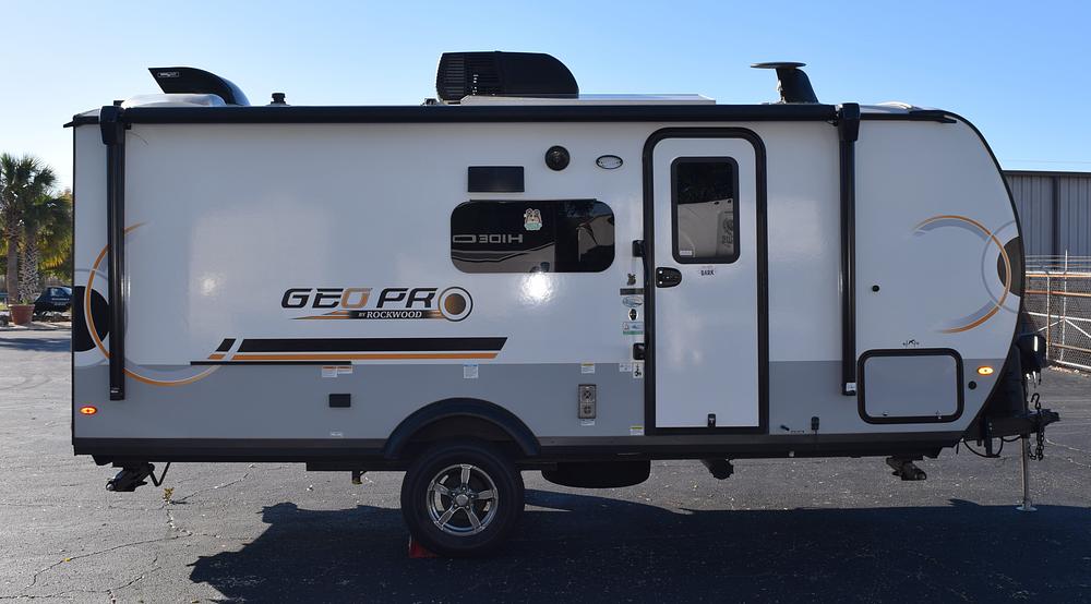 This 2022 Rockwood GeoPro (M-20BHS) is just the little unit for you! At 21ft, this travel trailer is the ideal set up for a couple or small family looking to hit the road. The front of the trailer houses a full/queen size bed with bedside shelf and overhead cargo net storage. The kitchen is equipped with a bench-style dinette that converts into a sleeping area, large sink, 3-burner stove/oven combo, microwave, 2-door fridge/freezer combo, and lots of storage options. This trailer also comes with twin bunks, which is great for small families for the kiddos to have their own space. The full bathroom is at the rear of the trailer. The unit is also stocked with a Coleman rooftop A/C, water heater, furnace, outdoor shower station, secondary mini door with access to the bunks, powered patio awning, powered leveling jacks, TV, and pop-up charging tower.
