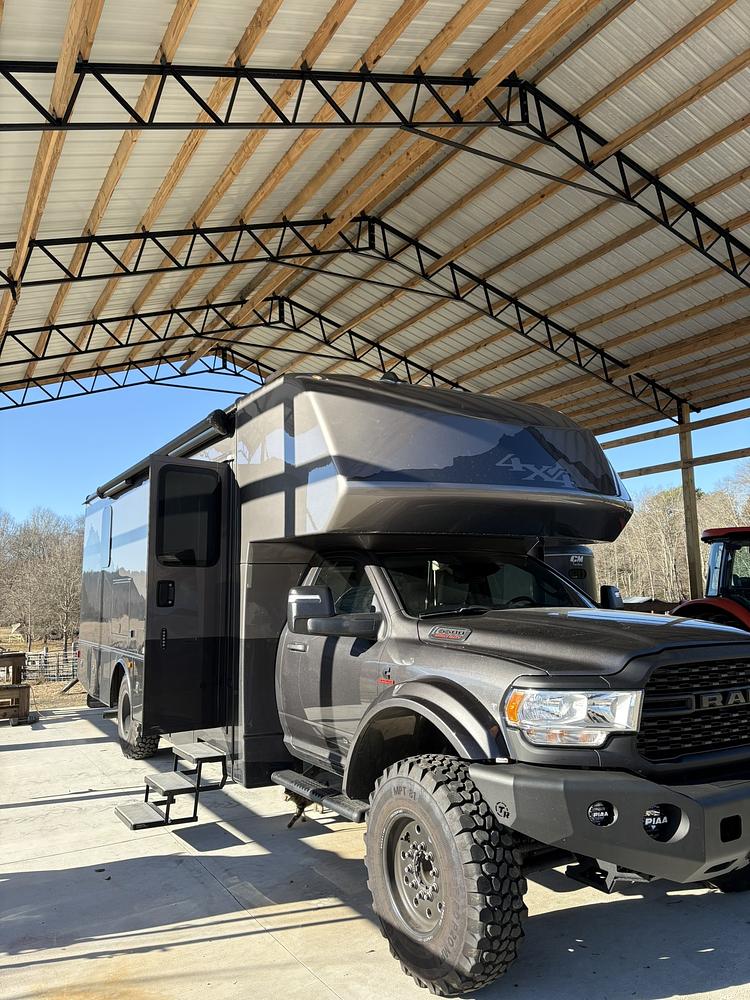 The Extreme Package on this motorhome features a lifted chasis (4 in rear & 2 in front), Super-Single rear wheels, 40 in tires with black aluminum wheels, custom wheel flares, a black grille, and an upgraded, off-road front bumper with LED lights. Seller has also equipped the rig with a spare tire and a roof access ladder.