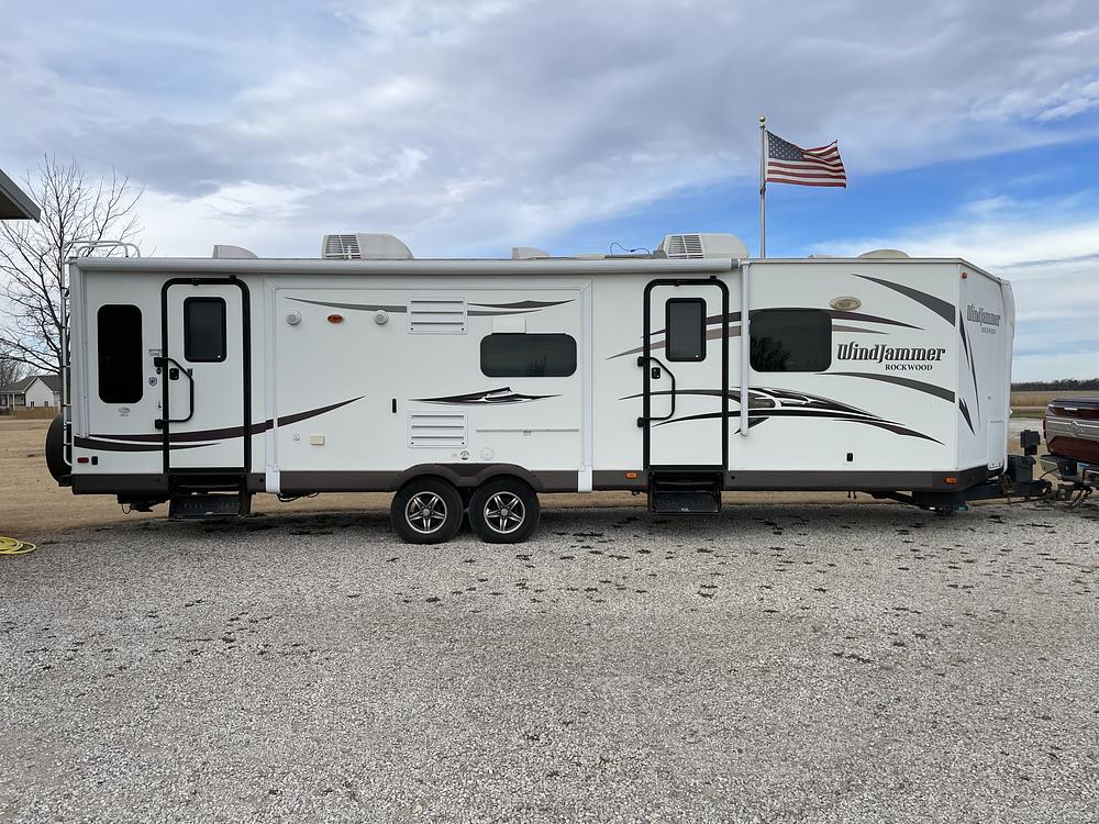 Very nice 2015 Rockwood RLT 3025W Windjammer Travel Trailer for sale by private owner. Overall length 34. Three slide-outs; -kitchen, bedroom, and living room. Mechanical includes two ducted A/Cs; -15,000 BTU & 13,500 BTU, ducted LP furnace, electric fireplace. Inside / entertainment includes Smart TV, Stereo with inside, outside, & bedroom speakers, queen bed, 1-year old sofa, dual theater seats. Bathroom has his & her sinks and porcelain foot-flush toilet. Exterior features include Blue-Ox weight-distributing hitch, alloy wheels, powered stabilizers, JobBox storage box, detached aluminum entry steps & stoop ($650 new). Everything works as it should. The trailer has been stored inside and looks good inside & out.