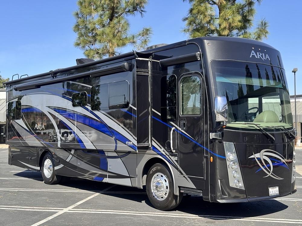 2019 Aria 3401 Model by Thor Motor Coach Class A RV motorhome diesel pusher, in absolutely beautiful shape! Originally owned and cared for by one owner, Runs excellent with 8758 original miles on a Freightliner chassis with the 360HP Cummins ISB engine, Perfect family layout with queen bunk over drivers cabin and rear king size private bedroom!