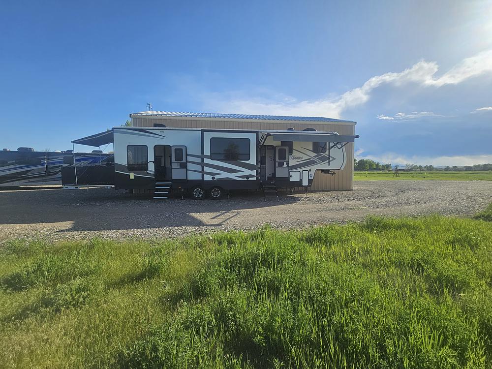 Equiped with Cummins Onan 5500watt generator, solar prep package, upgraded rv king mattress, EQ auto leveling system, three position heated and massaging leather reclining sofa, large double door lp or 110v refrigerator, 40 inch 12volt tv, 13ft garage with washer and dryer hookups, drop down leather seating and queen size bed, 2 power awnings, and patio kit.
