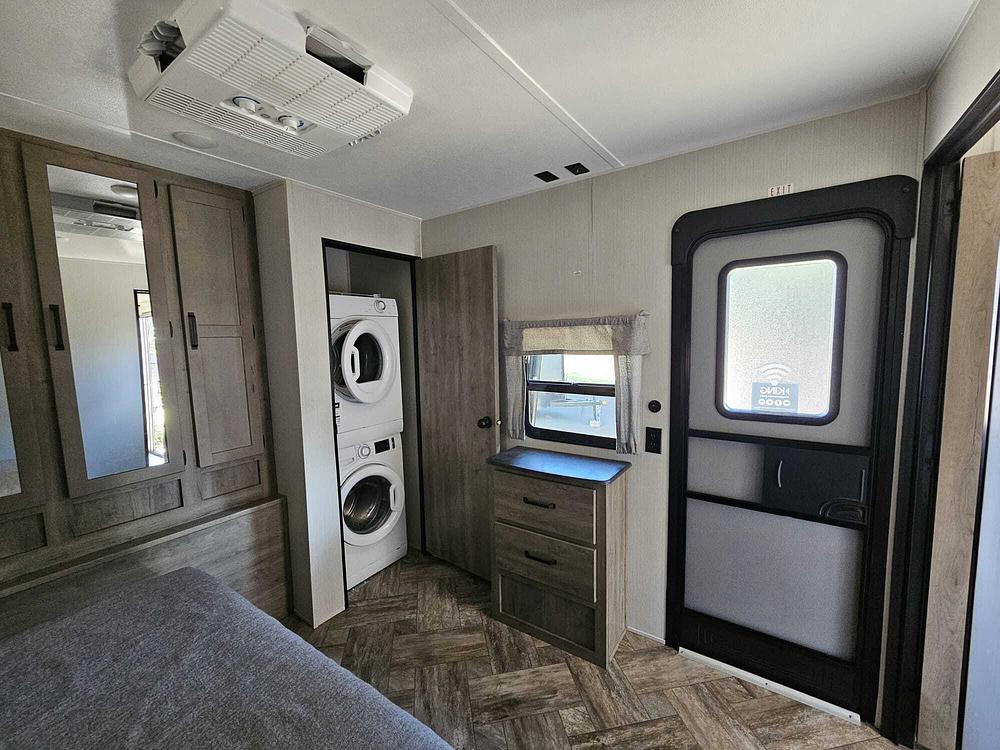 The exterior of the Palomino Puma Destination features a modern and sleek design with a durable construction, ensuring that it can withstand the rigors of the road. The interior is designed to provide all the comforts of home, with amenities such as a fully-equipped kitchen, cozy sleeping quarters, and a spacious living area, TV, fireplace, stackable washer and dryer.