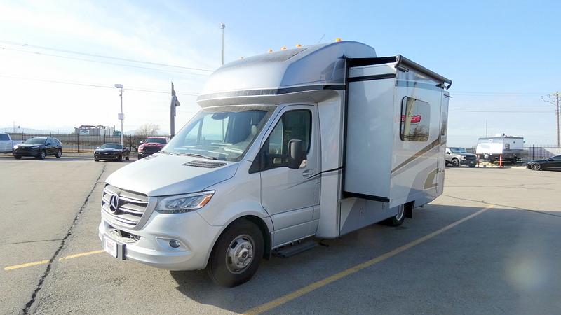 The USED 2024 Tiffin Wayfarer 25LW is a premium Class C diesel motorhome built on a Mercedes‑Benz 3500 chassis, blending luxury and drivability in a compact package. With one slide‑out that expands the living space and a thoughtful interior layout, it comfortably sleeps up to 5 people, thanks to rear twin beds that can convert into a king‑size sleeping area plus additional convertible seating/dinette space. The coach comes equipped with one powered exterior awning (about 16 ft) with integrated features for outdoor comfort, and a hydraulic leveling system to make setup easy and stable at the campsite. Standard comforts include a well‑appointed kitchen, bathroom with shower, ample storage, a 15,000 BTU air conditioner and premium interior finishes — all designed to deliver a comfortable and capable road‑ready home on wheels.
