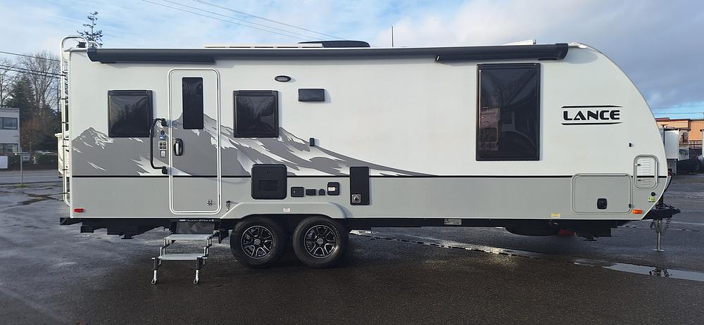 NEW 2026 Lance model 2255 is a 28', dual-axle travel trailer designed for couples, featuring a large, rear master bath, a front walk around queen bedroom with a walk-in closet, and a U-shaped dinette in a slide-out. It is known for its high-end, four-season construction, including Azdel composite walls, aluminum framing, and low profile design.