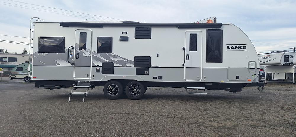 NEW 2026 Lance model 2565 is a luxurious, 30-foot, 4-season travel trailer featuring a unique rear lounge design with dual XL reclining chairs and large panoramic view windows. It is designed for comfort and extended, "livable" camping, typically featuring a single booth-dinette slide-out, a private queen bedroom, and a full bathroom.