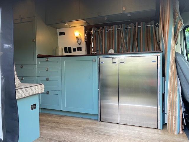 Water: Under the kitchen sink there is a 4 gallon fresh water tank and a 4 gallon grey water tank; in the vans garage there is an additional 4 gallon tank which can either be used for hot water outdoor showers or an extra water supply for the kitchen sink.