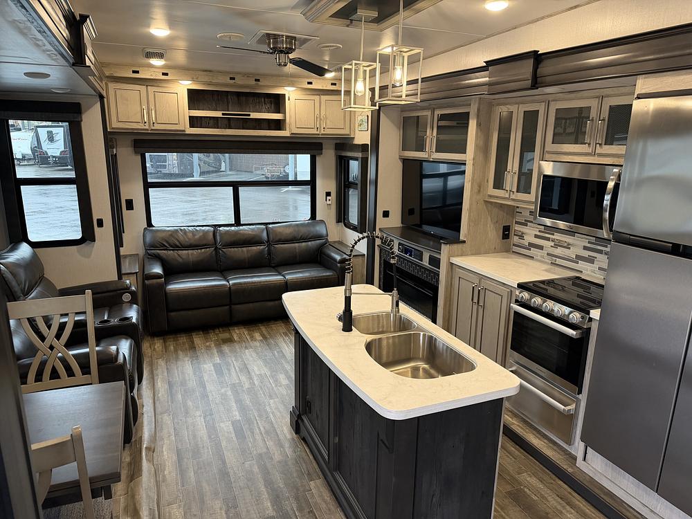 Beautiful, well-maintained 2021 Keystone Avalanche 312RS fifth wheel, built for comfort, space, and extended stays. This rear-sofa floorplan offers a wide-open living area with opposing slides, making it feel more like a luxury apartment on wheels than an RV.