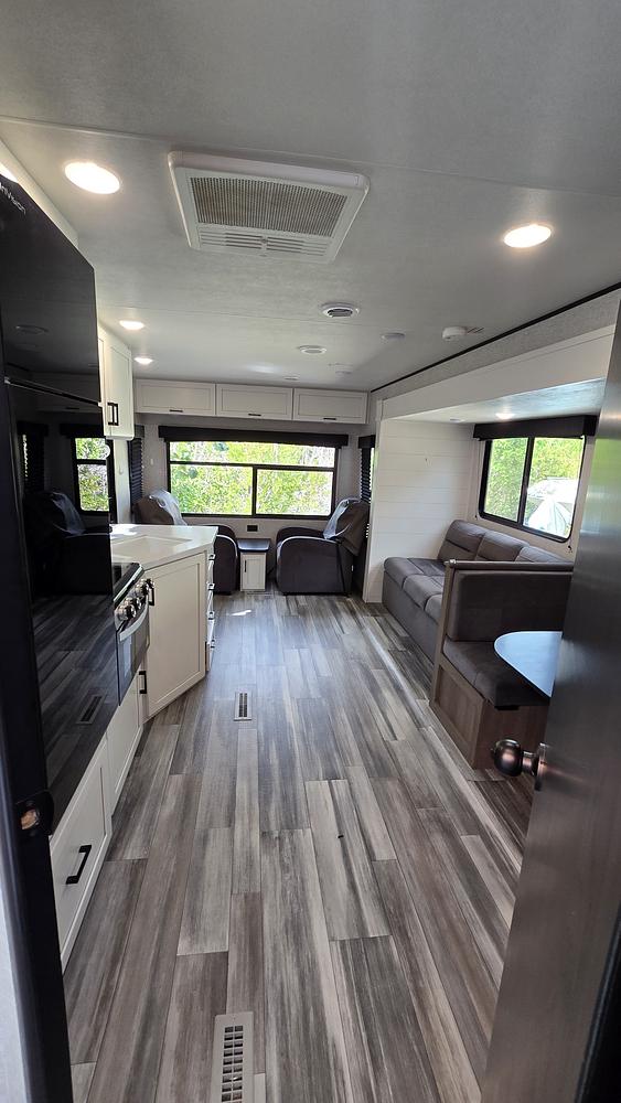Whether you're traveling solo or with a group, this travel trailer has everything you need to make your trip a success. The exterior features a durable construction and aerodynamic design for easy towing and improved fuel efficiency. With plenty of storage space for all your gear and belongings, you can pack everything you need for a memorable vacation.