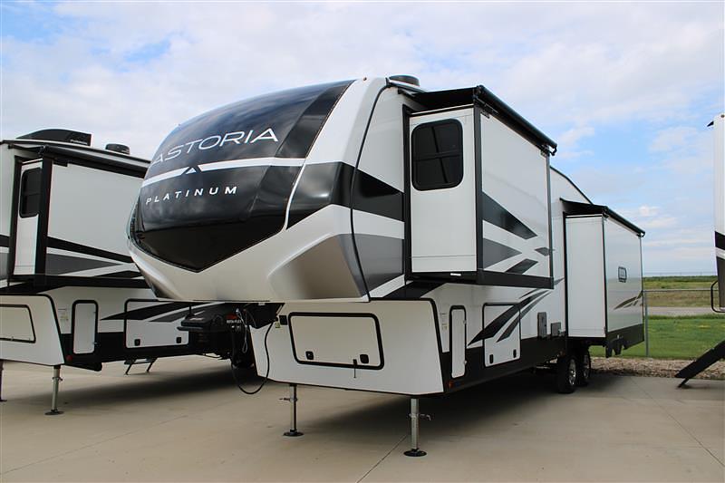 2026 Dutchmen Astoria 3173ELP with rear living! Tri fold soda, which folds out for added sleeping, in the back of the camper against a big picture window. Theater seating facing an entertainment center with fire place and TV. Mid kitchen area has an island with sink, table, chairs and a bench, 3 burner stove, oven, microwave, refrigerator, pantry and LOTS of cupboard space! Full bath with shower and double vanity. Master has a king bed in the slide, large closet, cabinet with storage space and washer/dryer hook ups, dresser and TV. Secure stance steps, electric awning, slide out topper, solar panel system, 2 ACs, and auto level system. BEAUTIFUL camper - stop by and check it out!