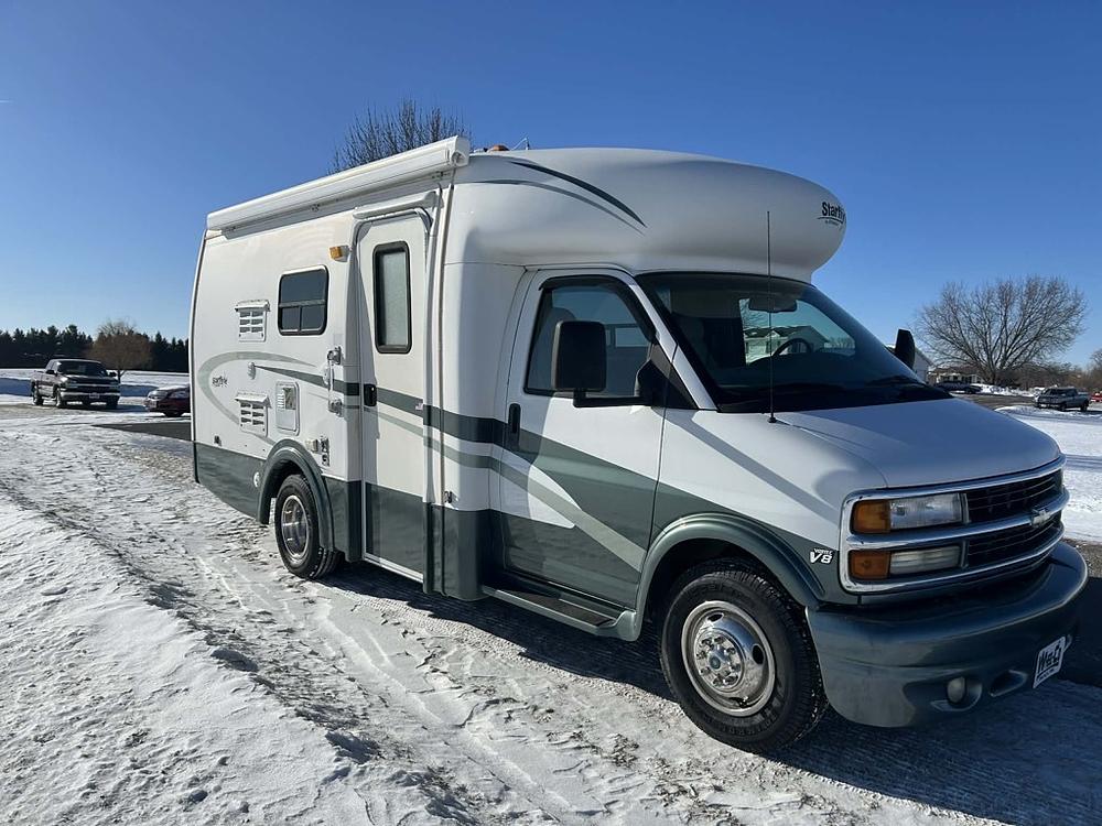 This is a 2002 DynaMax Starflyte. 22 ft bumper to bumper. It is on a Chevy express 3500 chassis. It has the 8.1 L motor, which usually comes with the Allison transmission, with 61,912 miles. Exterior passenger side awning. 4k watt generator, with 793 hours. Interior is really clean, cabinets are in nice shape, with lots of storage. It does have some light carpet wear, coach/bed, dinette/bed, 2 burner cooktop, microwave convection, sink, furnace, water heater and rooftop air conditioning. It does have entertainment system upfront with TV VCR radio/cassette deck combination. Interior and exterior speakers. this is a great camper, ready to hit the road.