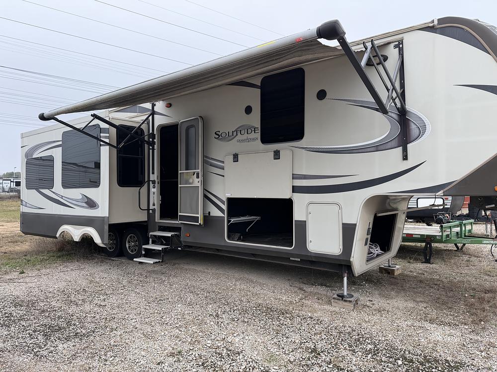 2015 Grand Design Solitude 369RL. In Willis TX. All appliances and electronics work. Ive been the only owner since it was bought new, and lived in it full time for 2 years before it simply became a weekend camper. It includes self leveling hydraulic jacks, push button awning, 3 slides, 2 air conditioners, furnace, heat pump, hot water heater and fridge that can run on either propane or electric, gas oven/stove, microwave, entertainment center with TV, sound bar, surround sound speakers throughout the RV, electric fireplace, 3 seat sofa with pull out bed, 2 recliner chairs, good sized bathroom and shower, king sized bed, washing machine and dryer, along with an enormous outdoor storage area that is also heated. The roof has never leaked, and I re-sealed all caulking to ensure water tight seals. The laminated front cap has pealed but I have had it inspected and confirmed it is only visual