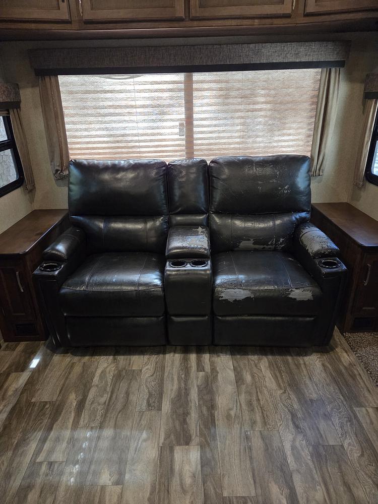 This RV is in good condition. The only issue is with the artificial leather coverings on the recliners and cushions, which have started peeling. Recovering or replacement will be needed. As a new owner, you may prefer to replace the double recliner with a sleeper sofa.