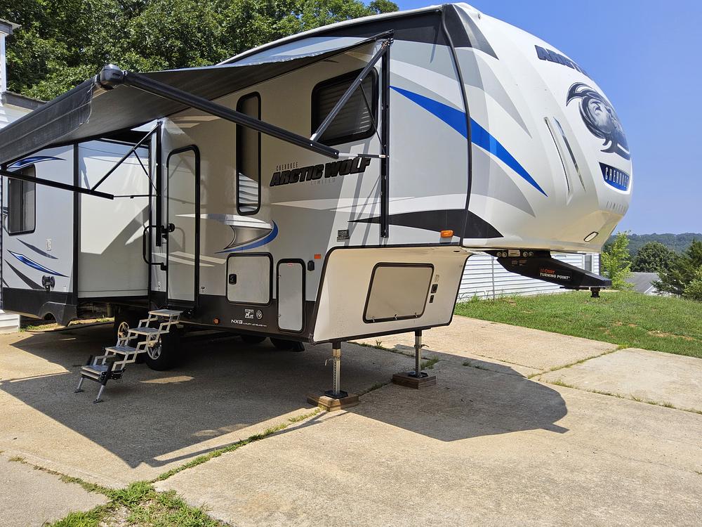 Used Like new Because many of the items in it are new like the theater seat and triple fold out couchThe front air conditioner is also newit does not come with 2 on this model I had it installed when I purchased it. All the slide seals have been replaced and the toilet has also been replaced.It is also equipped with 2batteries. The tires have been replaced and have about 3000 miles on them, The stairs going inside areas new and very desired especially if you have a narrow place to park and need to get inside the can fold down almost like a ladder the brand is Torklift or pull out into five step with separate adjustments on each leg of slope they cost about $900. It has 2 tvs and a 3 burner stove oven and microwave with exhaust fan the refrigerator is a 12 volt model a works great there is a 1000 watt power inverter and has the NGX LUxery Leveling sytem 4.4. There is a new .kitchen faucet with pull out hose and Bar top. I just install a maxair fan with remote in the bathroom the water heater is electric and gas the front air conditioner is also a heat pump.this unit is considered halfton towable I pulled it to California last October with my 2018 f150 king ranch with a 3.5 ecoboost and it pulled great I also just put in a new power converter. I am selling because I have bought a larger one.It has a transferable warranty valid until 6/15/2027 upon registration of new owner and a $75.00 transfer fee. Everyday not sold takes away any transferable warranty left this is a good camper lots of new items as noted in ad