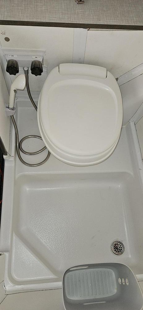 Inside the high-wall is a WET BATH, King and Queen bed, standard height counters, with stove, oven, double sink and microwave, giving the galley kitchen a true residential feel. It has generous prep space for everything one needs for effortless meal preparation. The dinette converts into additional sleeping accommodation for two. There is also an outdoor Kitchen, with a stove and sink that drains to the grey tank.