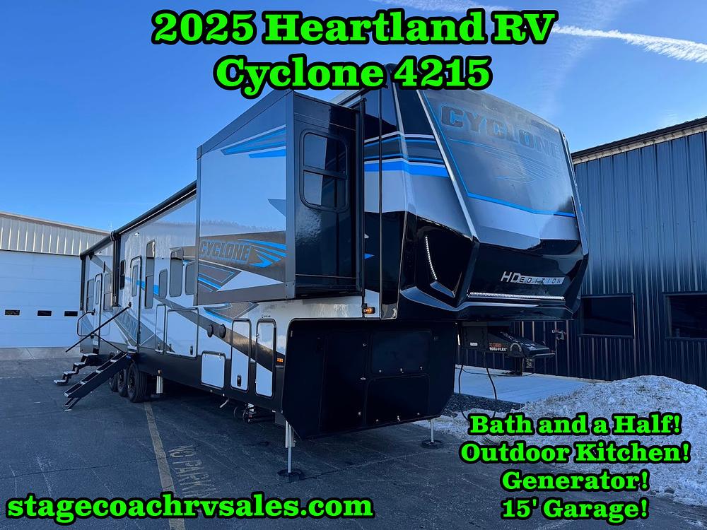 Satisfy your wanderlust with a Heartland Cyclone fifth wheel toy hauler! You won't have to sacrifice any luxury either with indulgent features like the king bedroom suite with an exclusive East to West bed tilt system with 30% more floor space, Stor-Mor three-sided access to the basement with 30% more storage capacity, and Step Caddy folding patio step for better stability as you enter or exit the patio. The industry first Grill and Go 25" residential pull out three burner griddle combo comes on models with an exterior kitchen for an easier cooking experience. The residential furniture gives you a high-quality experience on the road. If you like to dry camp longer then you will appreciate the industry's largest 150 gallons fresh water tanks. Come find the perfect model for you today!
