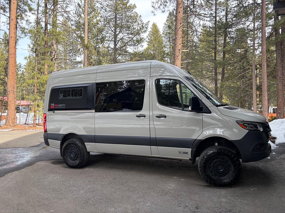 2025 Stone gray Mercedes 144 High roof AWD. 10" MBUX Comfort package, comfort seats, exterior lighting (HID headlights). Van compass Falcon adjustable front struts and rear shocks , Amp research steps . Toyo 275/70/17 AT tires and Black Rhino Arsenal rims . Trail Koncepts murphy lounge build with tall cabinets (mtn. bikes fit under deployed murphy bed) , indoor shower, removable toilet. sofa sleeper converts into a second bed when rotating front seat. 460 ah Lithium battery system with Victron components, 20 gallons of fresh water, separate under body grey water tank for the indoor shower. Full 4 season capability with 4Kw diesel fueled heater and all water system components mounted inside the van. TK takes the time to fully sound dampen and thermally insulate the interior compartment everywhere possible. This is a fully loaded van built for the owner of Trail Koncepts and is in nearly new shape. Check out our website www.TrailKoncepts.com