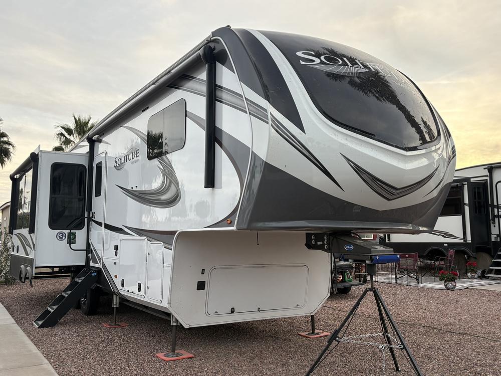 Excellent condition, low mileage, stored indoors or under cover when not in use. Features arctic insulation package, electric fireplace, king bed, residential refrigerator with inverter. Additional items included: 400W portable solar panel, 2 water filters and water softener, 50amp surge protector, fifth wheel tripod stabilizer, and new batteries installed September 2025. Arizona resort site available until May 1st at a discounted rate.