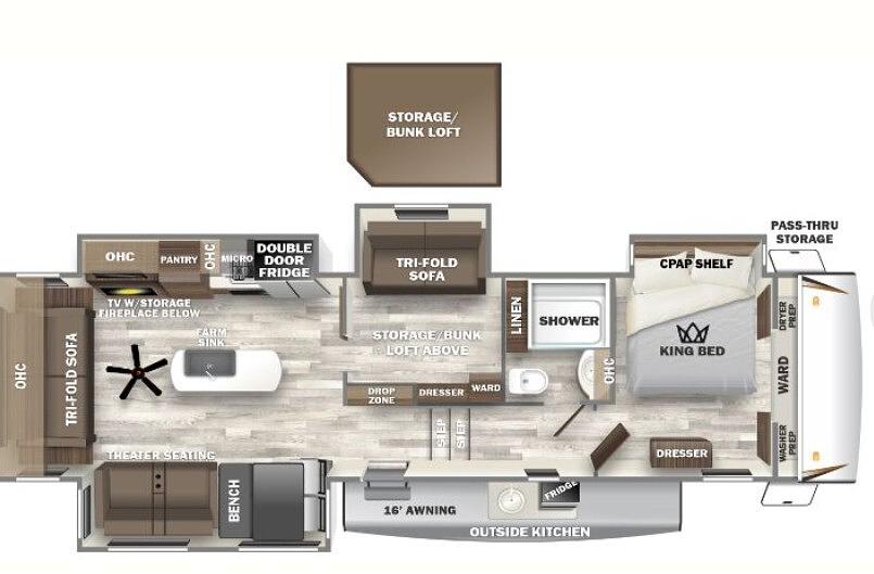 Outside, the Sabre shines with its sleek exterior design and convenient features like an electric awning, outdoor kitchen, and exterior speakers. Whether you're relaxing under the stars or entertaining friends, this model has everything you need to enjoy the great outdoors in style.