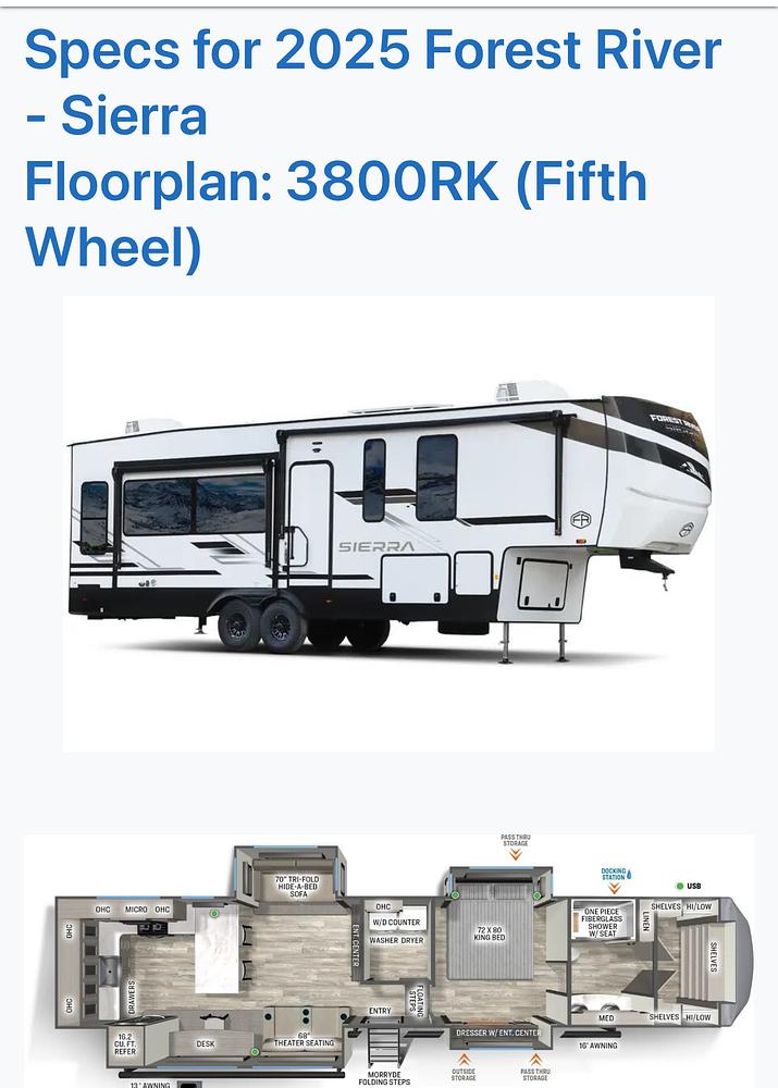 The 2025 Forest River Sierra 3800RK is a luxurious fifth wheel trailer that offers the ultimate in comfort and style for your travels. With a sleek exterior design and spacious interior layout, this RV is perfect for those who enjoy the finer things in life. The Sierra 3800RK is equipped with all the amenities you need for a home away from home, including a fully equipped kitchen, cozy living area, and comfortable sleeping quarters-this model is ready to hit the open road and take you on your next adventure. Whether you're planning a weekend getaway or a cross-country road trip, the Forest River Sierra 3800RK has everything you need to make your journey memorable. So why wait? Start planning your next adventure today with the 2025 Forest River Sierra 3800RK.