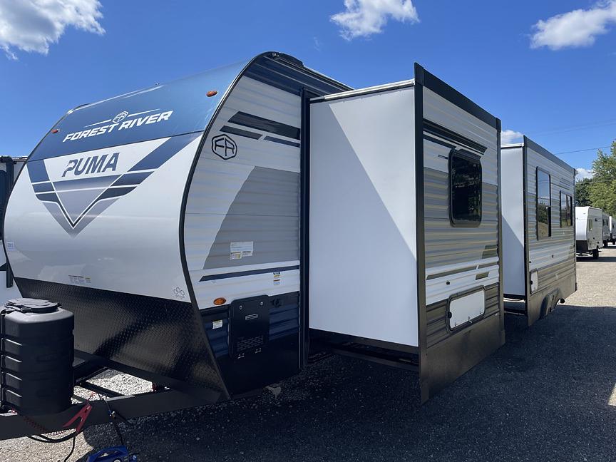 OWN THIS UNIT FOR ONLY $339.15 per month w/ approved credit! This rear bathroom trailer features a Couch/Dinette Slide-Out, and a Bedroom Slide and only weighs 7,374lbs! This Trailer is equipped with ducted 15,000BTU A/C, 2nd Bedroom A/C, Power Awning, LED Lighting throughout, Microwave, TV Antenna, AM/FM/Bluetooth Stereo w/ Soundbar and Exterior Speakers, 39" LED TV,12VOLT 11 Cubic Foot Refrigerator, Gas On Demand Water Heater, Oven w/ Glass Stove cover, Furnace, Electric Fireplace, Washer/Dryer Prep, Roller Shades, Jack-Knife Sleeper Sofa, Exterior Grab Handle, Black Tank Flush, Aluminum Triple Solid Step Upgrade, Rockguard, 20lb# LP Tanks, Battery Disconnect, Prewired for a back up camera, Enclosed Underbelly, Electric Stabilizer Jacks, Power Tongue Jack, and Spare Tire. Micro Outside Kitchen w/ 110 Refrigerator and Gas Griddle.