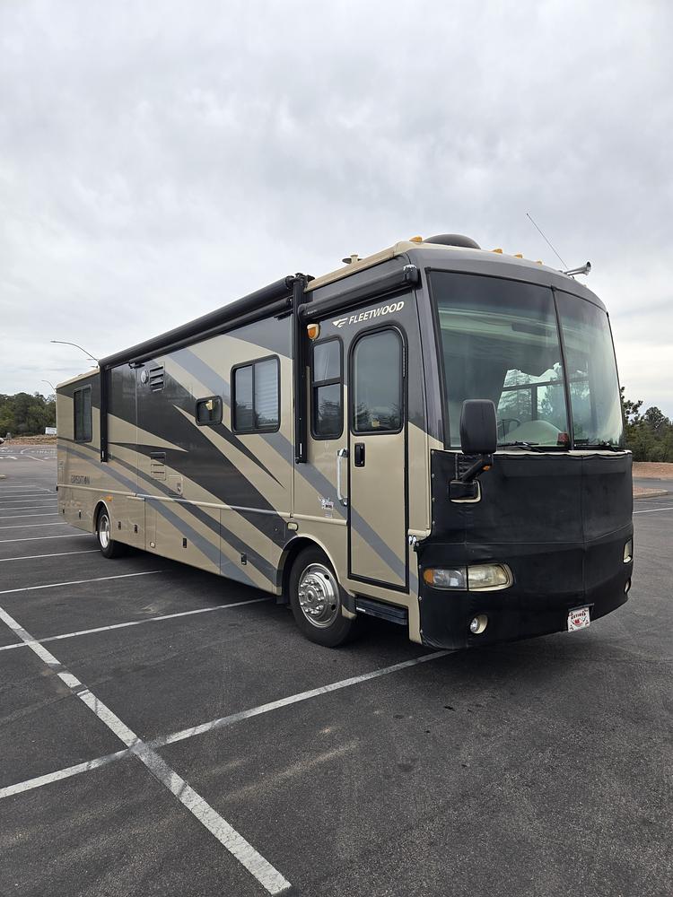 This 2006 Fleetwood Expedition 38N is a 38-foot Class A diesel pusher built on a Freightliner chassis with 33,795 miles on a 300HP Caterpillar engine and Allison transmission. It features three slide-outs, a 7.5kW Onan generator, dual A/C units, and sleeps up to 6 people. Key features include a 10-gallon water heater, washer/dryer combo, and substantial storage.