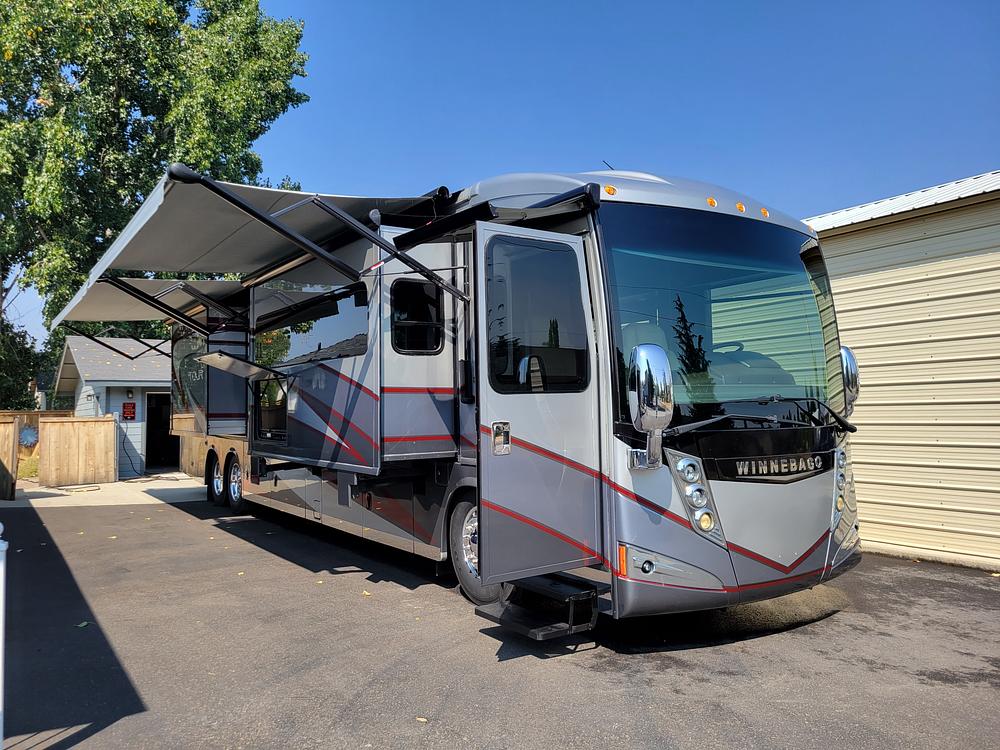2015 Winnebago Tour 42HD, stored in building, 35000 miles (new engine/after treatment system has 800 miles on it). Exterior: Newer tires (under 2000 miles), full body paint, entertainment package (tv, fridge, cooktop), 2 awnings, Aquahot water/heating, 2 rooftop heat pumps/AC, 1 rooftop AC, water filtration system, powered hose and power cord reels. Interior: Washer, dryer, Dirt Devil built-in vacuum, dishwasher, 2 televisions, induction cooktop, convection/microwave oven, 1.5 bathrooms, large shower, king bed, safe, power heat/massage captains' seats, residential fridge w/water and ice dispenser, large pantry cabinet.
