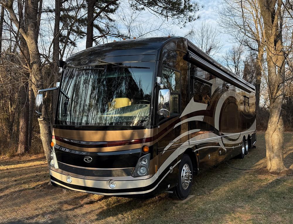 This 2015 American Tradition 42M features a sleek exterior, luxurious and comfortable interior and all the amenities you could possibly want: fully equipped kitchen: induction stove, residential refrigerator, ample counter space. Spacious open, heated flooring with 3 slides -- one a full side length. King size bed. Ensuite bathroom with shower, half-bath, mid-coach for guests. Washer-dryer.