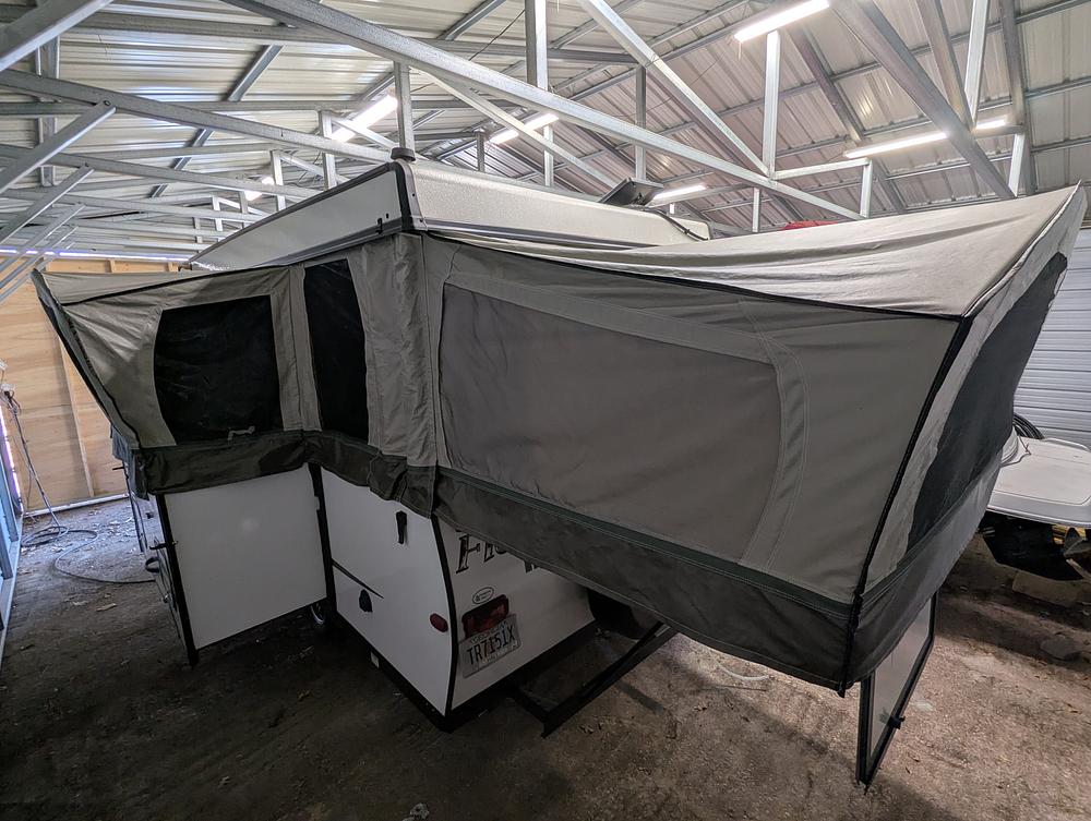 This Forest River Flagstaff High Wall camper is in excellent shape and was always stored in a garage. If the normal popup toilet/shower puts you off camping, the high wall is for you. The bathroom has real wood sides and has a true black water tank not a simple cassette design. There are some thoughtful upgrades that make camping more enjoyable including hanging baskets, an ac condensate drain hose to keep the water off the canvas, a remote ac 2-stage thermostat which keeps the temperature constant even on the hottest days and an ac soft-start allowing operation from a generator. Also included are Gekko slide out covers which make hot and cold weather camping very comfortable.