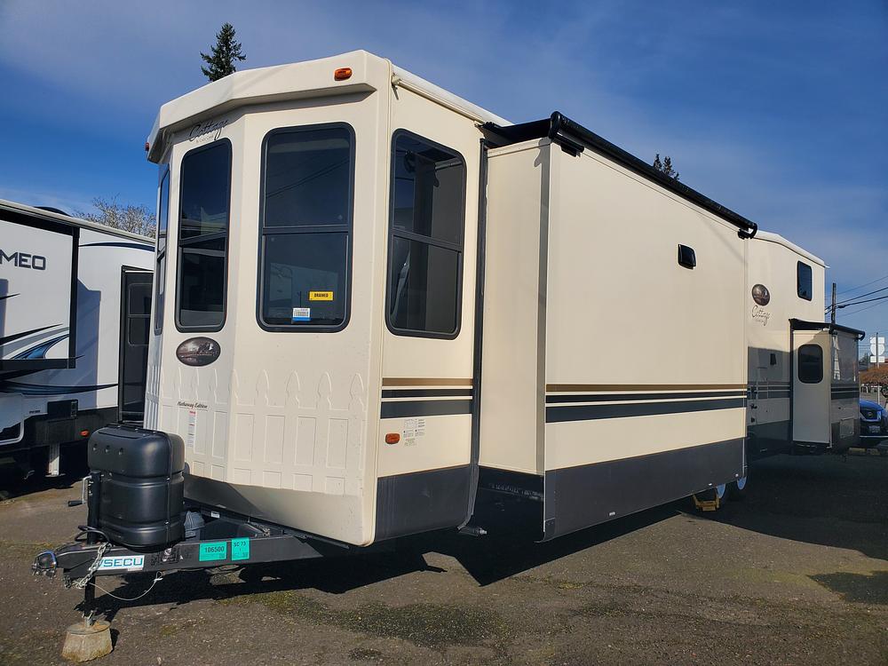 Comes with 2 Year Service Contract when purchased at the advertised price. Beautiful Front Living Destination Trailer w/ 3 Slides, Tank Heater, Washer/Dryer Units, Upstairs Loft. Sleeps 6.