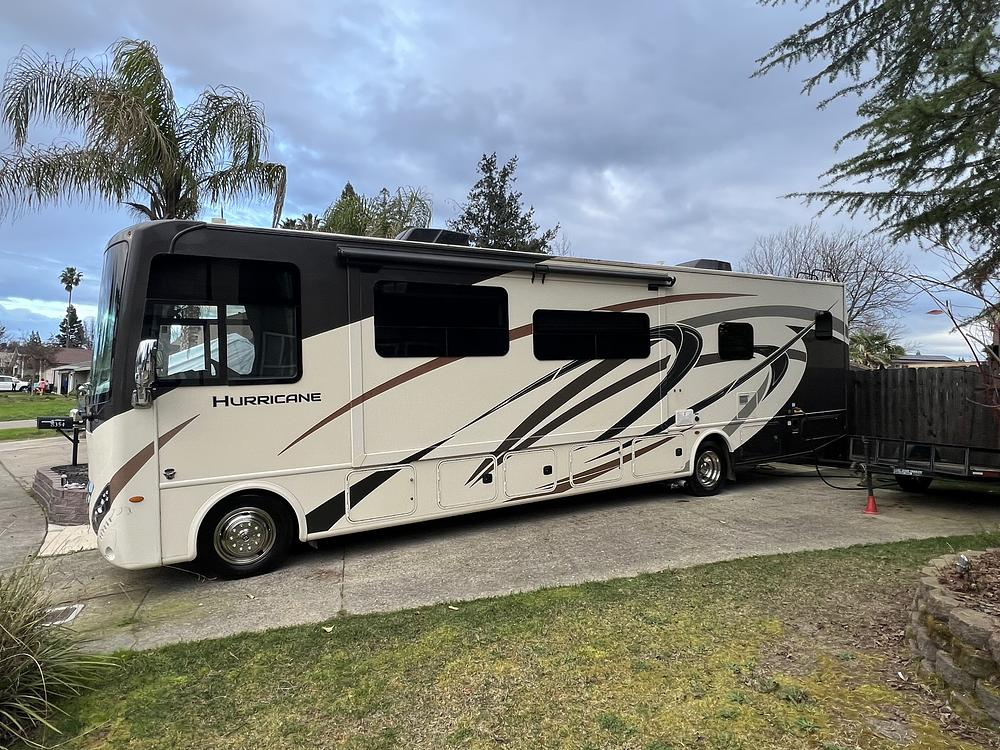 Immaculate 35M w/2 slides & only 7,363 miles on a Ford Triton V10 engine! Great floor plan loaded with many options! 1 1/2 baths w/full size shower in mstr bath. Mstr bdrm has a king size bed w/side tables, built-in dresser w/6 large drawers & closet for hanging clothes, built-in desk w/110 & USB plug ins & a 32 TV. Main living area has a half bath w/tons of storage, washer/dryer cabinet w/hookups, L Shaped jack knife couch, 55 TV & gas fireplace! Kitchen has a residential stainless steel fridge w/ice maker, 3 burner gas stove, oven, lg microwave & a dbl sink w/covers! Full size bunk above driver, 2 a/cs, auto lvl jacks, backup & side cameras, brand new large awning w/ new LED lights, outdoor TV, Solar, Onan 5500 generator, brand new deep cycle house batteries, Fantastic Fan w/thermostat temp control & remote, passenger side pull out desk for working on the road, Smart panel that works everything & hooks to your phone. Tons of storage under coach! Shes a beauty!!