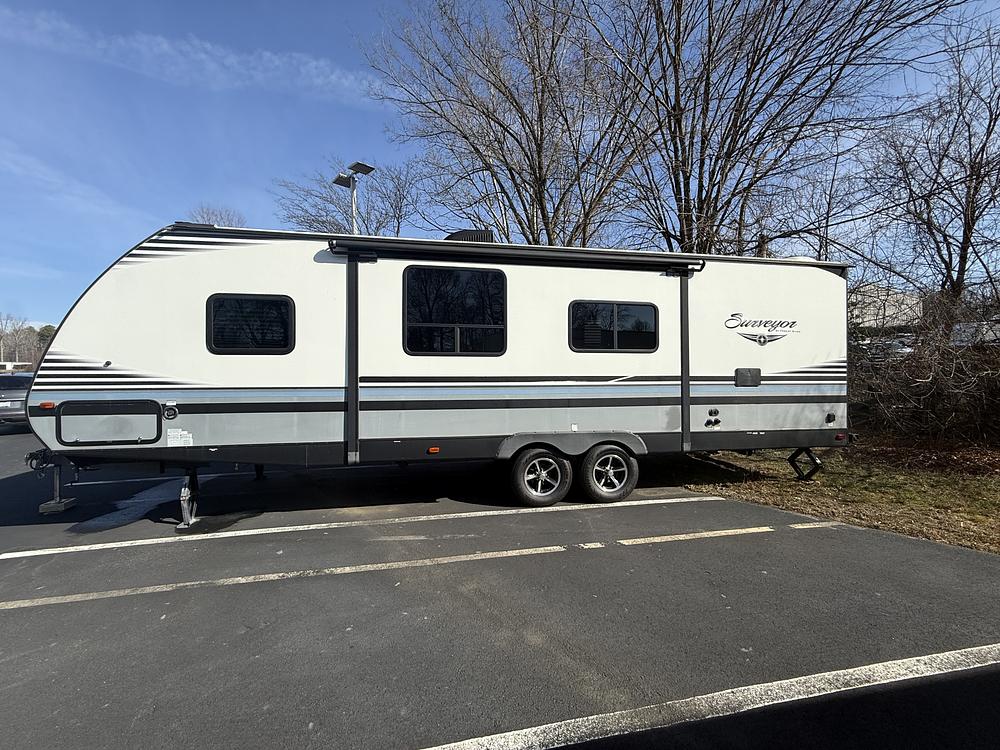 For Sale with Title--Luxury Forest River Surveyor travel trailer in excellent condition with all new tires and with a outdoor kitchen, 3 TVs, private Master Bedroom, 2 queen-size bunk beds, sofa that converts into a queen bed and dining area that converts into a queen bed to sleep 6-8. Outdoor Kitchen with outdoor sink, refrigerator, and grill, along with outdoor shower. Indoor Kitchen with Freezer and Refrigerator, Oven and Stove, and double sink and a large Pantry and Dining area that seats 4. Private bathroom and shower. Sofa bed in living room with TV. New mattress in large master bedroom with TV. Wifi system for camping and entertaining. Outdoor speaker for hanging exterior TV for cooking out and watching the game. Spacious shower inside the private bathroom. Plenty of storage inside and out of this great camper. Ready for a new family to enjoy!