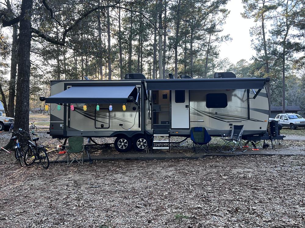 Hike the trails, fish the lake, and relax indoors after the cook whips up a meal with full amenities in the rear kitchen which also includes extra counter space that can be utilizes as a desk as well, and a center island that provides more prep and serving surface, and a place to dry the dishes. The 44" booth dinette allows you to eat your meals together and watch the LED TV with fireplace below. The theater seating is another comfortable place to relax, and the double entry bathroom is convenient especially at night. And the cook will love having an outside kitchen with a burner top and refrigerator, plus there is an outside griddle.